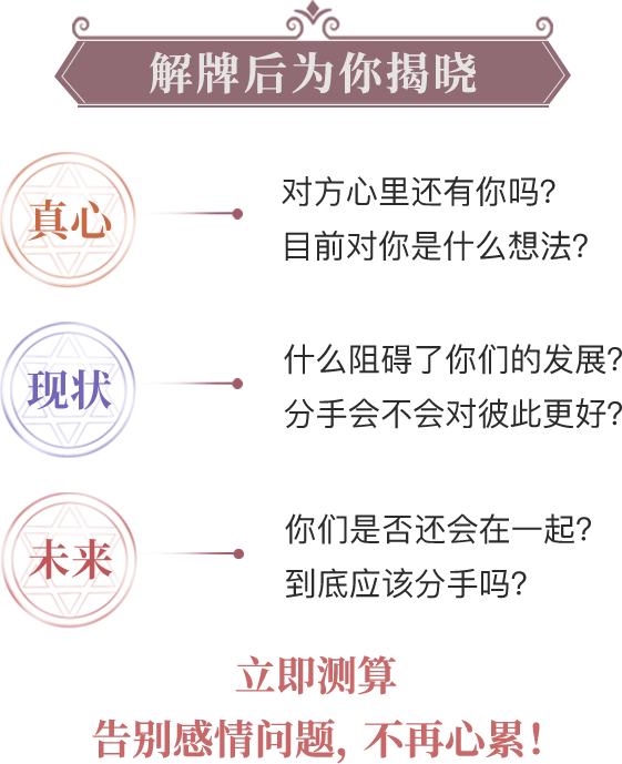 塔罗牌算的真的是太准了,完全说出了我当前感情存在的问题,也给了我建议,我知道该怎么做了!鲁*女士